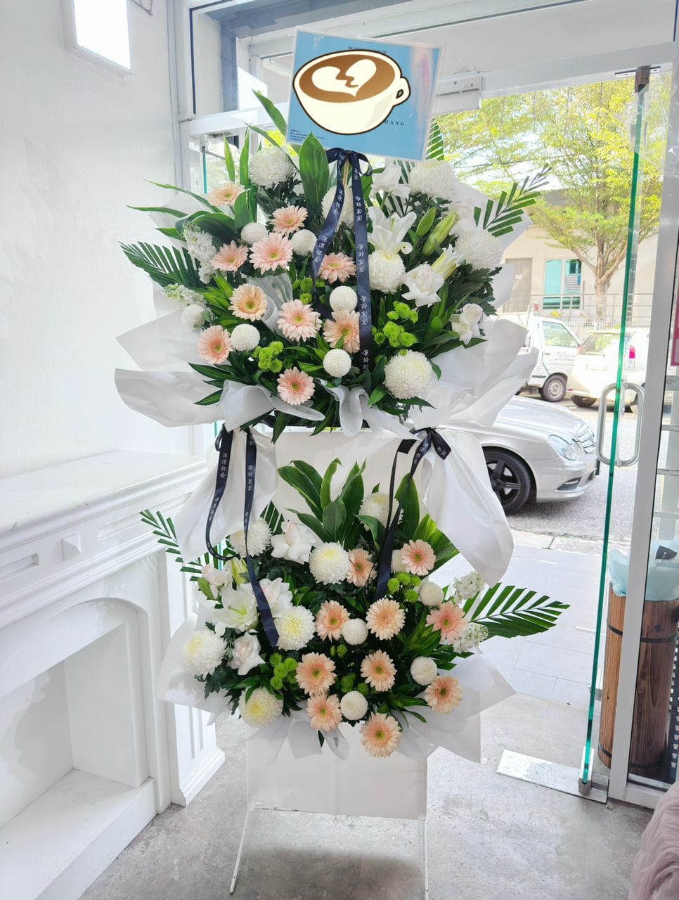 This double-layer condolence flower stand is elegantly arranged with serene, tasteful blooms, exclusively delivered to funeral parlours across KL and Selangor, including Nirvana 1 Sungai Besi (富贵纪念馆 ) and Nirvana 2 Bukit Seputeh (富贵生命馆).