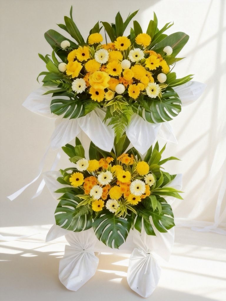 We are a professional florist serving the Klang Valley area, specializing in sympathy flower stands. Our arrangements come in single, double, and triple-tier options. Shown here is our double-tier stand.