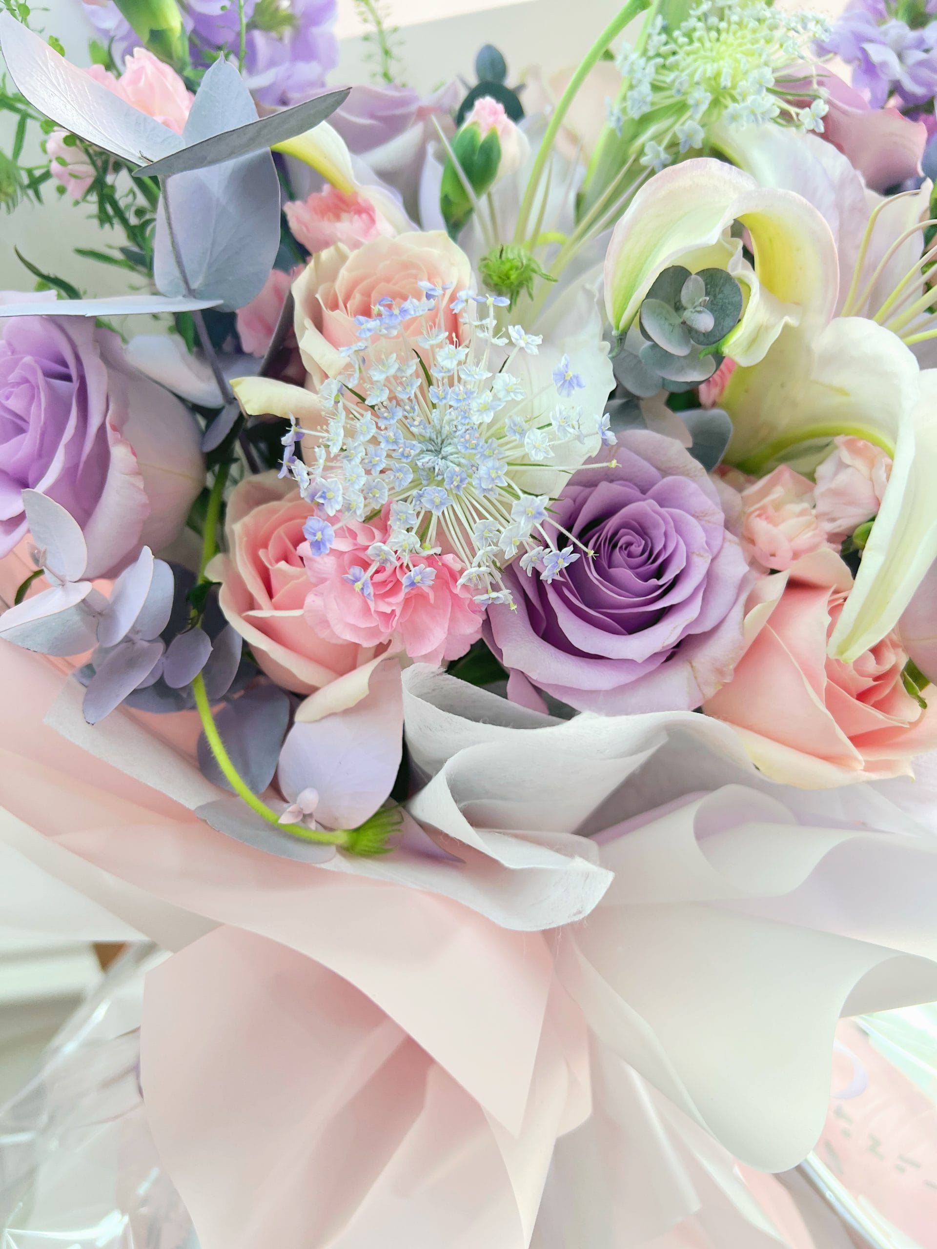 As shown: 5 Purple Rose, 5 Pink Rose, 1 Lily, Matthiola, Eustoma, Baby’s Breath, Eucalyptus, Other Blooms and Message Card Included