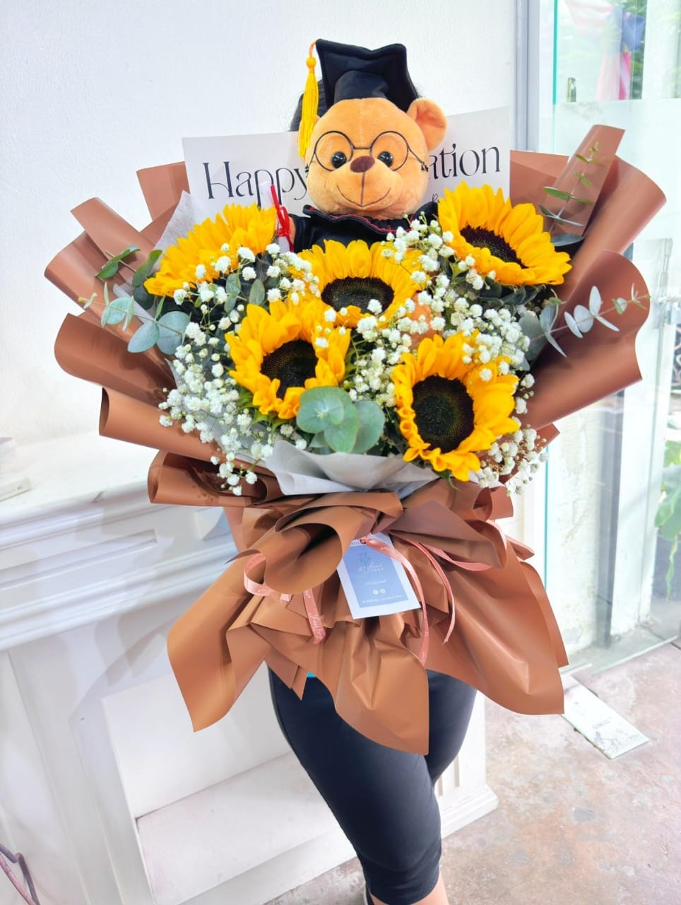 As shown: Sunflower, Baby’s Breath, 15cm Graduation Convo Bear, and Other Blooms