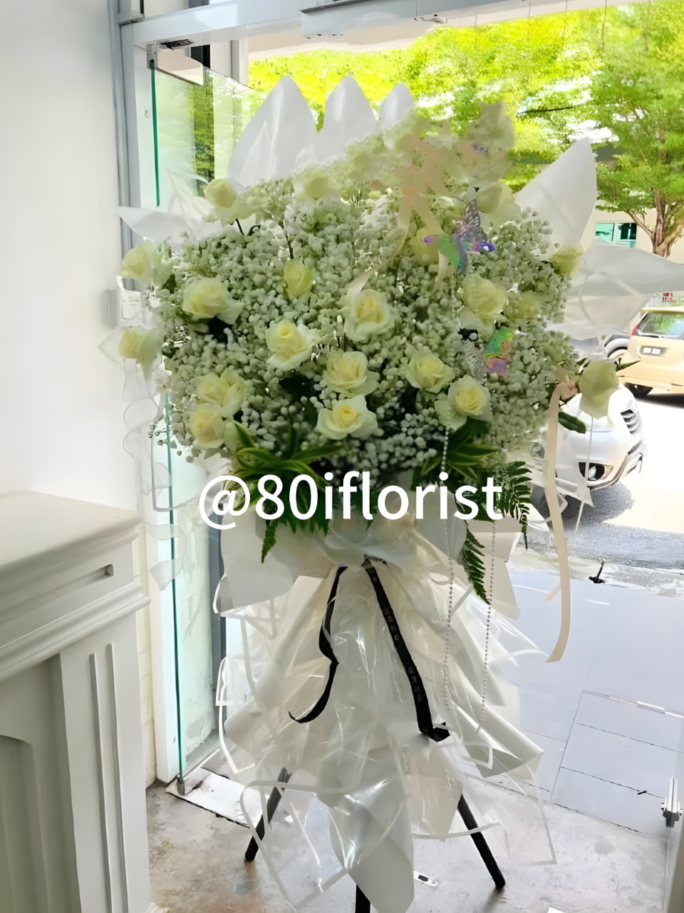 This elegant funeral flower stand features white roses, delicate baby’s breath, and lush green foliage, all accented with a white wrapping. Each bloom is thoughtfully arranged to create a serene and dignified tribute.